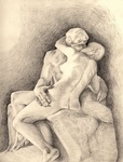 2010De Kus is het meest bekende beeld van Rodin. Hij maakte het in 1886 en het werd voor het eerst op de Salon tentoongesteld in 1898. Twee geliefden zijn versmolten in een oneindige omhelzing. De zachte vloeiende vormen van de geliefden contrasteren sterk met het blok ruw gebeitelde marmer waarop zij zitten- een symbool van hun aardgebondenheid. Rodins interesse in het idee om de menselijke figuur uit steen te bevrijden gaat terug op zijn bewondering voor Michelangelo. Hij gebruikte hier wat hij in Michelangelo's Slaven gezien heeft. Deze lijken zich los te rukken van de steen waaruit zij voortkomen. Met de Kus was vanaf het begin het plan de massa ruw gehakte marmer waarop de geliefden zitten te incorporeren in het werk, waarmee het symbolisch wordt voor hun aardse passie. Het contrast in oppervlak (ruw tegenover gepolijst) benadrukt de sensuele zachtheid van de lichamen. Ook dit werk is afkomstig van de Hellepoort.