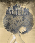 She reminds me of the ladies parading at the horse racing track, with extravagant hats. The castle is surrounded by water and it looks as if the Lady emerged from under it. I first got the idea of using this castle from the comic Bob & Bobette (Suzy & Spike) 'The treasure of Beersel'. The comic is best known from the movie 'Luke and Lucy: The Texas Rangers'.